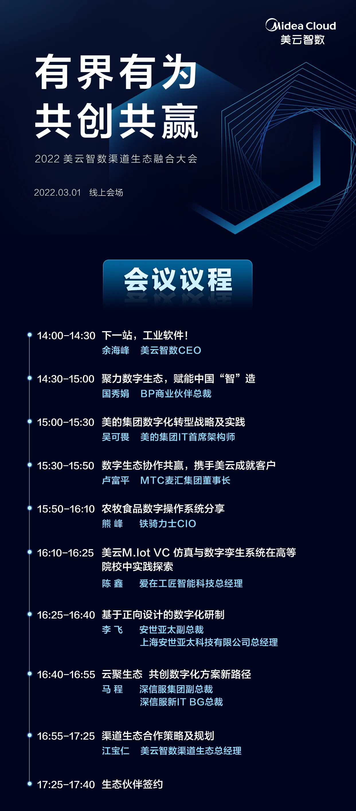 美云智数全新策略升级,“2022美云智数渠道生态融合大会”3月1日线上会场重磅来袭!500+嘉宾齐聚一堂,有界有为,共同打造智能制造的数字生态。六大合作模式全渠道招募1000+生态伙伴,预计2022年触达超过20000家企业客户,呼唤更多的合作伙伴加入,共赢2000亿中国工业软件产业市场。大咖云集,共探数字生态,成就中国“智”造!